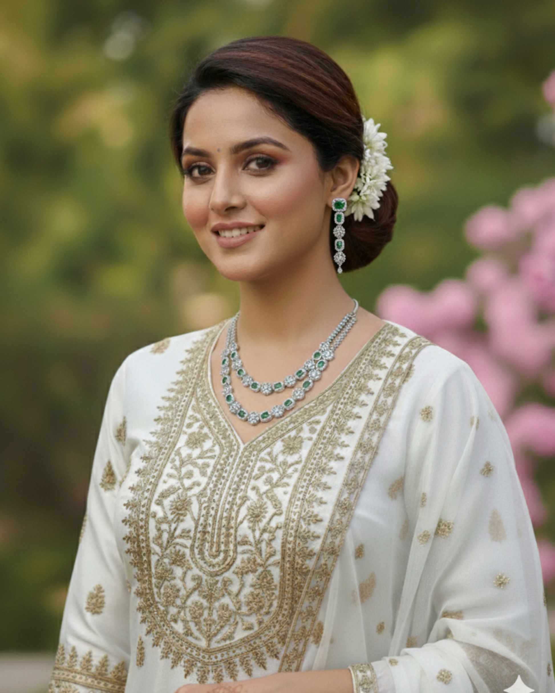 The Lalima Necklace Set exudes royal charm with its exquisite double-layer design. Each link alternates between dazzling diamond-cut CZ flowers and deep green emerald stones, creating a statement of refined luxury. Perfect for weddings, festive occasions, and elegant evenings.