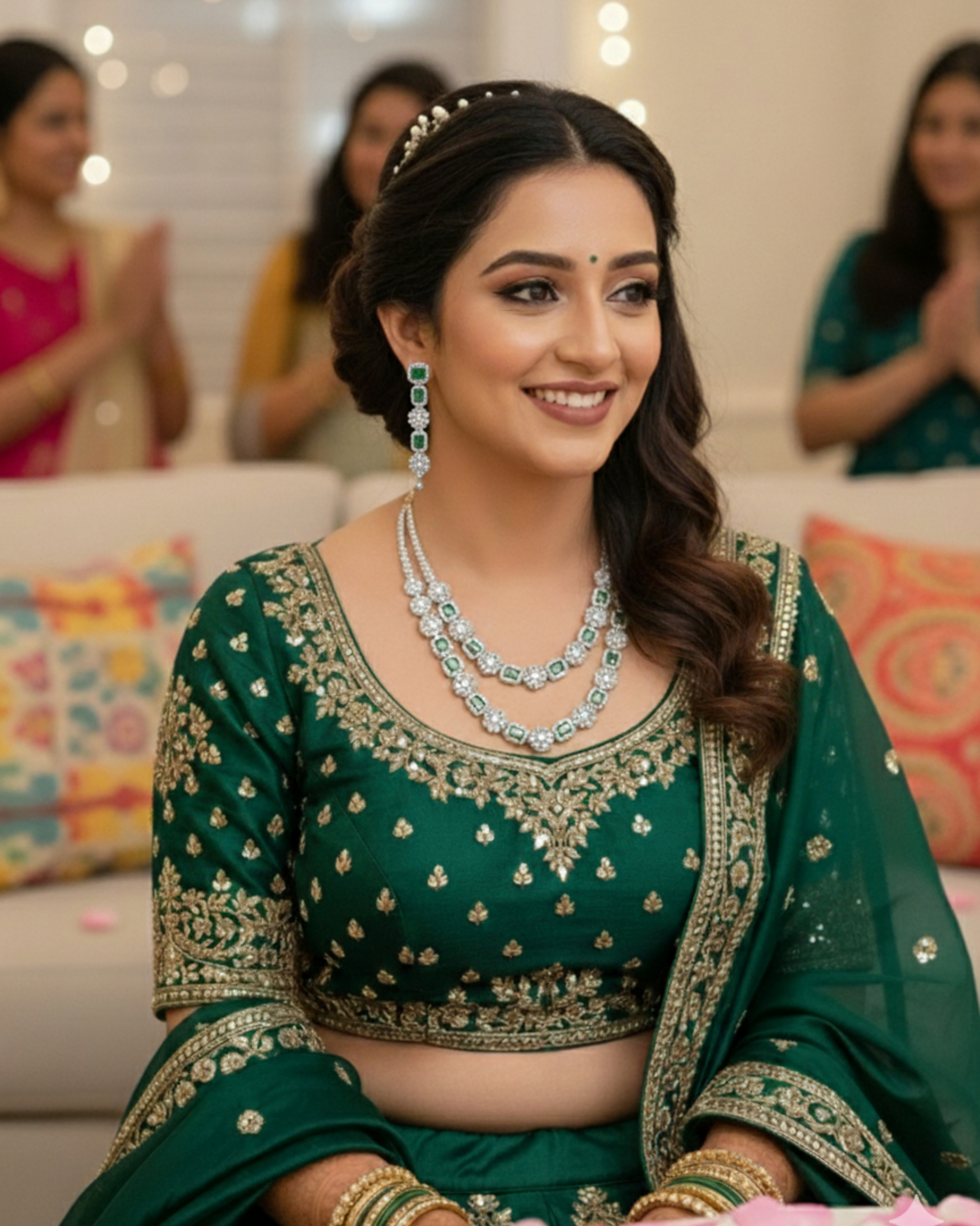 ✨ Style Tip: Pair with light-colored sarees or pastel lehengas to let the emerald tones stand out beautifully
